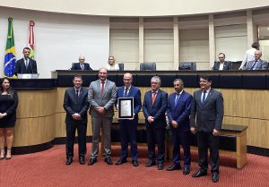 A Justiça Eleitoral de Santa Catarina foi homenageada, na última quarta-feira (12), em sessão especial da Assembleia Legislativa do Estado (Alesc). O presidente do TRE-SC, Desembargador Leopoldo Augusto Brüggemann, recebeu as homenagens direcionadas ao Tribunal e também em reconhecimento pela atuação na presidência da corte eleitoral.
